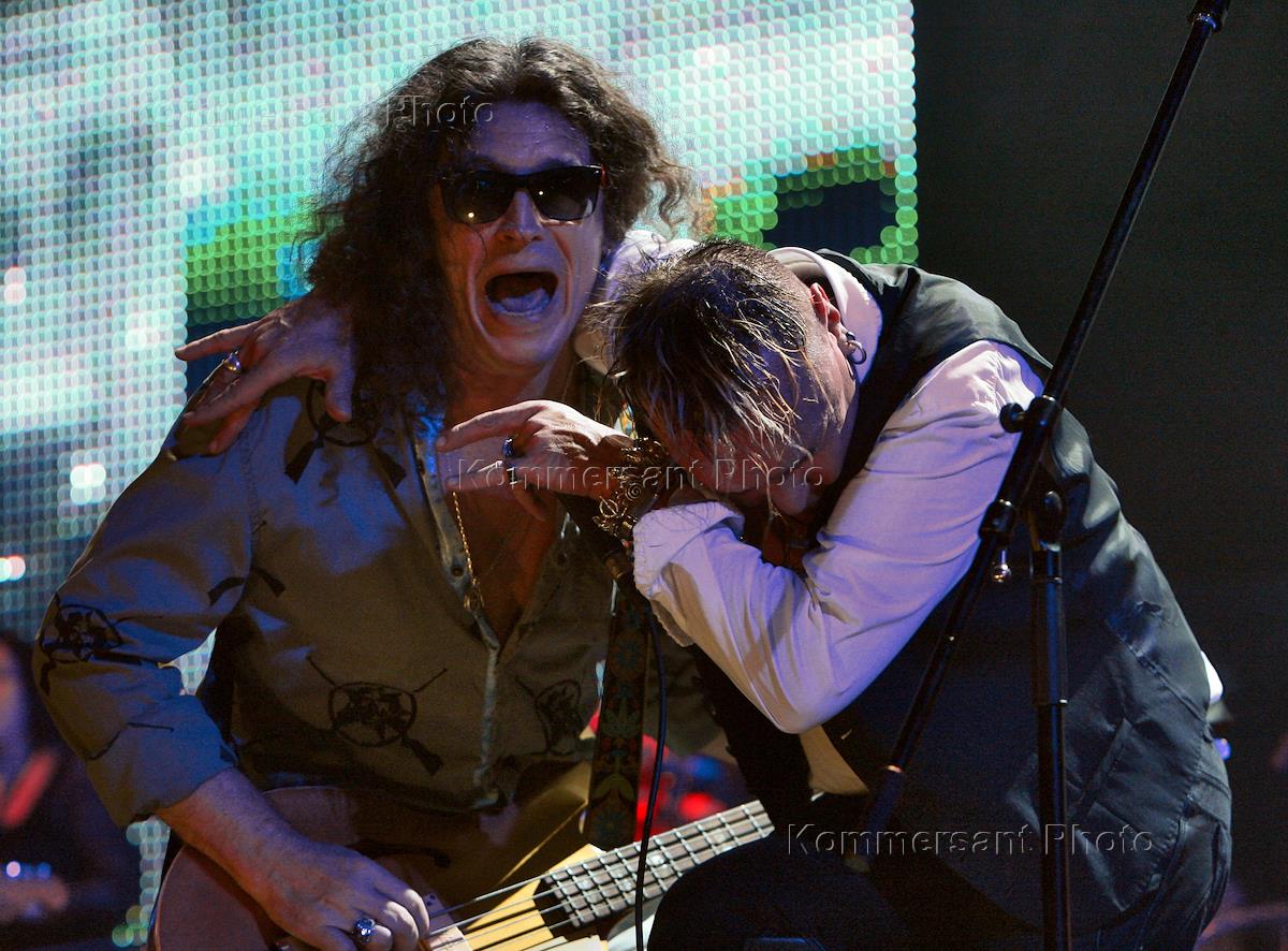 Лидер группы "Неприкасаемые" Гарик Сукачев (слева) и солист группы "Калинов мост" Дмитрий Ревякин (справа) во время выступления на концерте, посвященном 50-летию Гарика Сукачева, в спортивном комплексе "Олимпийский".