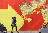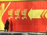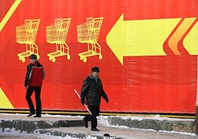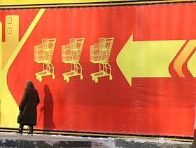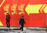 Жанровая фотография. Прохожие на фоне рекламного баннера универсама.