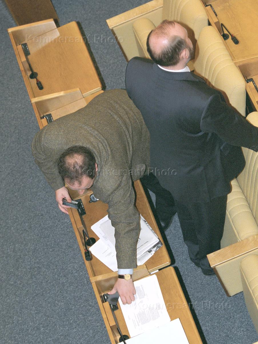 Депутат Государственной Думы России от фракции "Единство" Владислав Резник (слева) и председатель Комитета Государственной Думы России по законодательству Павел Крашенинников (справа) во очередного думского заседания.