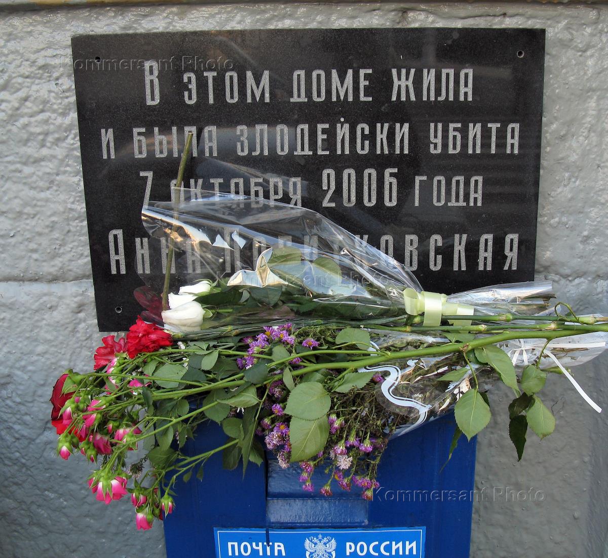 Flowers and a commemorative plaque on the facade of a house where murdered journalist Anna Politkovskaya lived.
