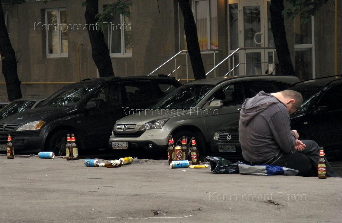 A man sitting among the empty bottles and cans of beer against the background of parked cars.