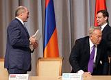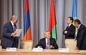 Слева направо: президент Армении Серж Саргсян, президент Казахстана Нурсултан Назарбаев и президент России Дмитрий Медведев после заседания ЕврАзЭС.