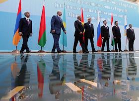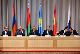 Слева направо: президент Армении Серж Саргсян, президент республики Беларусь Александр Лукашенко, президент Казахстана Нурсултан Назарбаев, президент Киргизии Курманбек Бакиев, президент России Дмитрий Медведев и президент Таджикистана Эмомали Рахмон на заседании ЕврАзЭС.