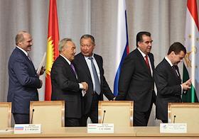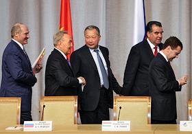 Слева направо: президент республики Беларусь Александр Лукашенко, президент Казахстана Нурсултан Назарбаев, президент Киргизии Курманбек Бакиев, президент Таджикистана Эмомали Рахмон и президент России Дмитрий Медведев на заседании ЕврАзЭС.