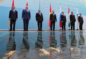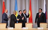 Слева направо: президент Армении Серж Саргсян, президент республики Беларусь Александр Лукашенко, президент Казахстана Нурсултан Назарбаев, президент Киргизии Курманбек Бакиев, президент России Дмитрий Медведев, президент Таджикистана Эмомали Рахмон и генеральный секретарь ЕврАзЭС Таир Мансуров во время совместного фотографирования после заседания ЕврАзЭС.