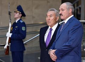 Президент Казахстана Нурсултан Назарбаев (слева) президент республики Беларусь Александр Лукашенко (справа) после заседания ЕврАзЭС.