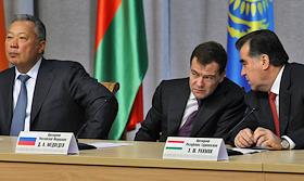 Слева направо: президент Киргизии Курманбек Бакиев, президент России Дмитрий Медведев и президент Таджикистана Эмомали Рахмон во время заседания ЕврАзЭС.