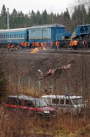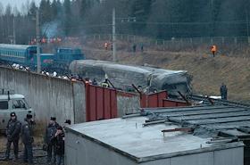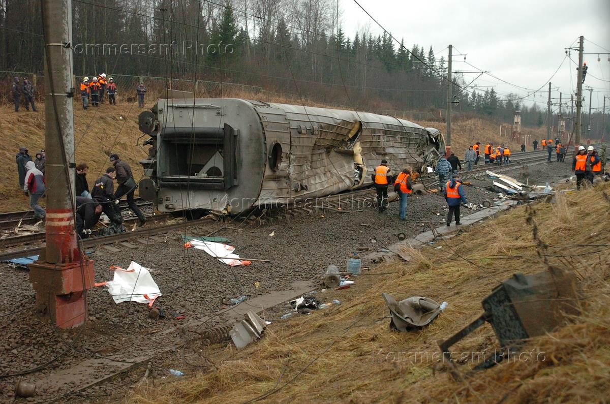 Место крушения поезда "Невский экспресс", сошедшего с рельсов в результате теракта вечером 27 ноября 2009 года. Скорый поезд потерпел крушение в километре от административной границы Новгородской и Тверской областей. Погибли 25 человек, судьба 26-ти пока неизвестна. В больницах остаются 85 пострадавших.
