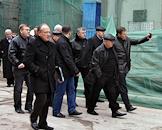 Первый заместитель мэра в правительстве Москвы Юрий Росляк (третий слева) и мэр Москвы Юрий Лужков (второй справа) у реконструируемого основного здания Большого театра России.