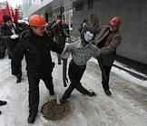 Пикет работников Алтайского тракторного завода (АТЗ) (ОАО "Алттрак") у офиса холдинга "Региональная ассоциация топливных материалов" (РАТМ). Пикетирующие избивают куклу, символизирующую собственника завода президента РАТМ Эдуарда Тарана, задолжавшего рабочим более 100 млн рублей.