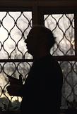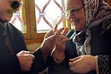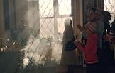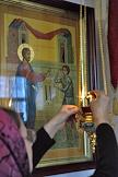 Служительница зажигает лампадку у иконы "Исцеление глухонемого" в храме во имя Тихвинской Иконы Божией Матери.