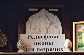 Рельефные иконы для незрячих в храме во имя Тихвинской Иконы Божией Матери.