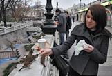 Жанровая фотография. Девушка кормит птиц на Манежной площади.