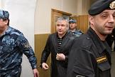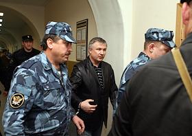 Экс-представитель Государственного собрания - Курултая республики Башкортостан в Совете Федерации Игорь Изместьев (в центре) после рассмотрения ходатайства об его аресте в Басманном суде. Игорь Изместьев обвиняется в покушении на жизнь Урала Рахимова, сына президента Башкирии и в неуплате налогов.