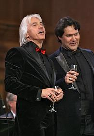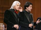 Оперные певцы Дмитрий Хворостовский (баритон) (слева) и Ильдар Абдразаков (бас) (справа) во время выступления в сопровождении Государственного академического симфонического оркестра им. Е.Ф.Светланова на Вечере вокальной музыки. Концерт прошел в Большом зале консерватории (БЗК).