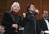 Оперные певцы Дмитрий Хворостовский (баритон) (слева) и Ильдар Абдразаков (бас) (в центре) во время выступления в сопровождении Государственного академического симфонического оркестра им. Е.Ф.Светланова на Вечере вокальной музыки. Концерт прошел в Большом зале консерватории (БЗК).