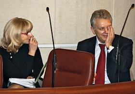 Представитель в Совете Федерации (СФ) России от Курганской областной думы, заместитель председателя комитета Совета Федерации по аграрно-продовольственной политике Сергей Лисовский (слева) и министр сельского хозяйства России Елена Скрынник (справа) на пленарном заседании Государственной думы России.
