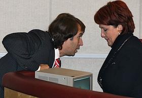 Министр здравоохранения и социального развития России Татьяна Голикова (слева) и министр промышленности и торговли России Виктор Христенко (справа) на пленарном заседании Государственной думы России.