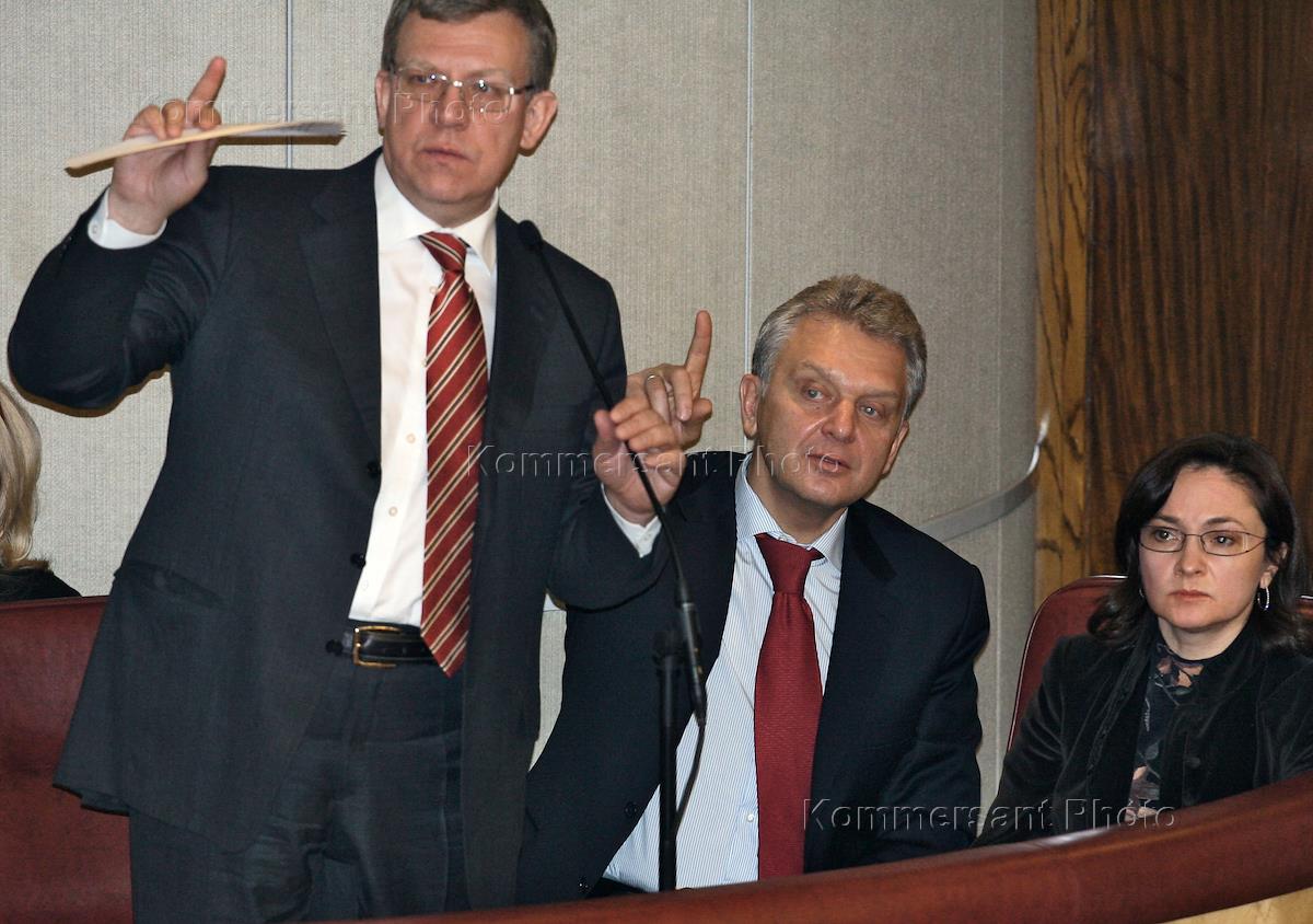 Слева направо: председатель Центрального Банка России Сергей Игнатьев, министр здравоохранения и социального развития России Татьяна Голикова и заместитель председателя правительства России, министр финансов России Алексей Кудрин на пленарном заседании Государственной думы России.