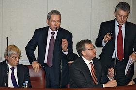 Министр промышленности и торговли России Виктор Христенко (сидит), министр регионального развития России Виктор Басаргин (слева во втором ряду), председатель комитета Государственной думы России по вопросам местного самоуправления Вячеслав Тимченко (справа во втором ряду) и полномочный представитель правительства России в Государственной думе России Андрей Логинов (стоит слева в третьем ряду) на пленарном заседании Госдумы.