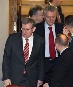 Слева направо: председатель Центрального Банка России Сергей Игнатьев, министр регионального развития России Виктор Басаргин, министр здравоохранения и социального развития России Татьяна Голикова, заместитель председателя правительства России, министр финансов России Алексей Кудрин и министр промышленности и торговли России Виктор Христенко на пленарном заседании Государственной думы России.