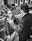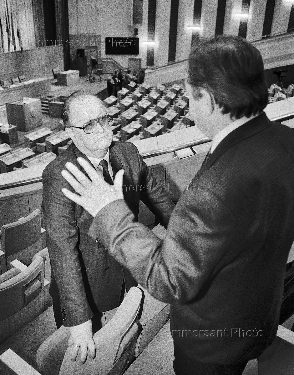 Председатель Центрального Банка России Виктор Геращенко (слева) и министр внешне-экономических связей России Сергей Глазьев (справа) перед началом заседания Верховного Совета России.
