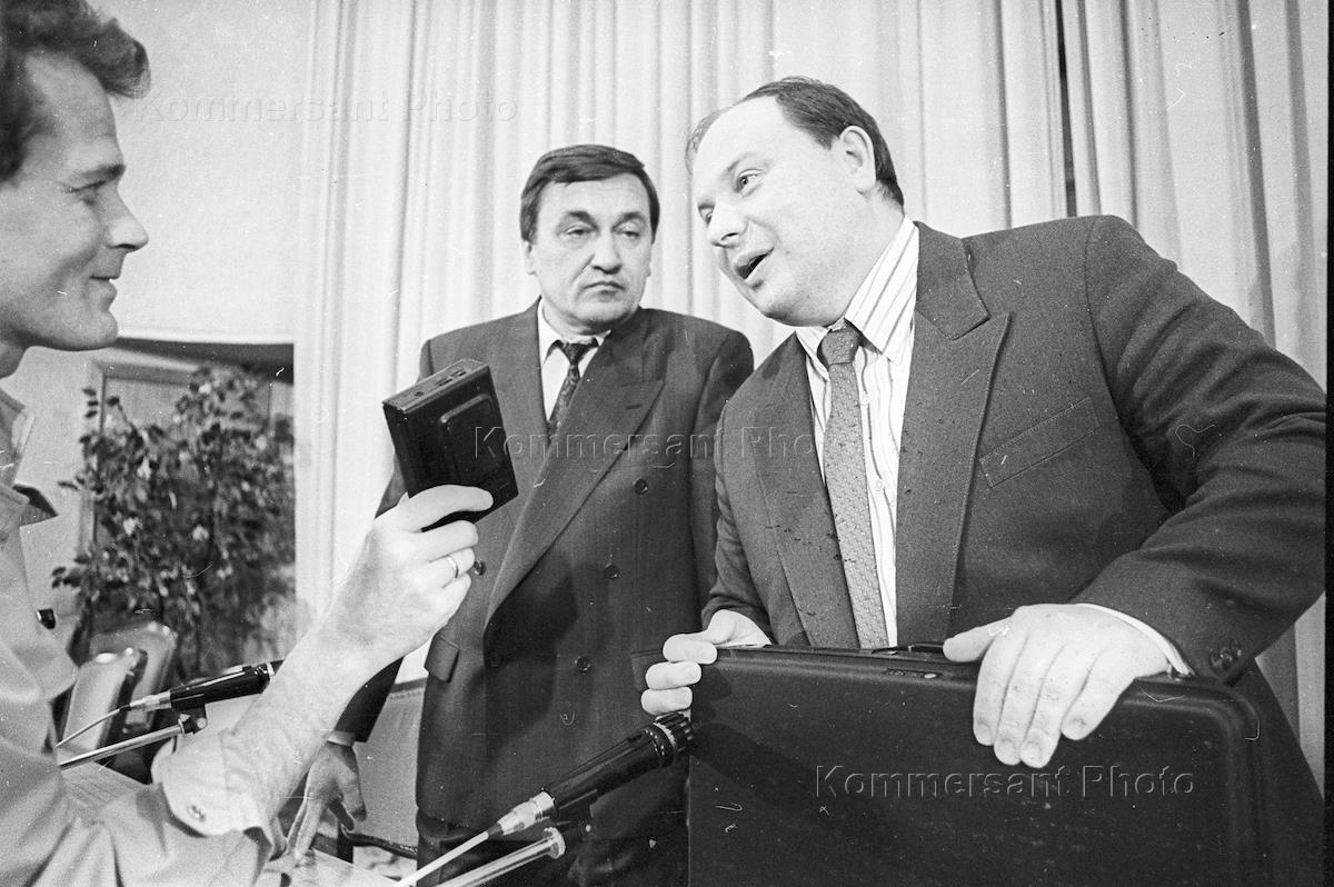 Первый заместитель председателя правительства России Егор Гайдар (справа) на пресс-конференции.