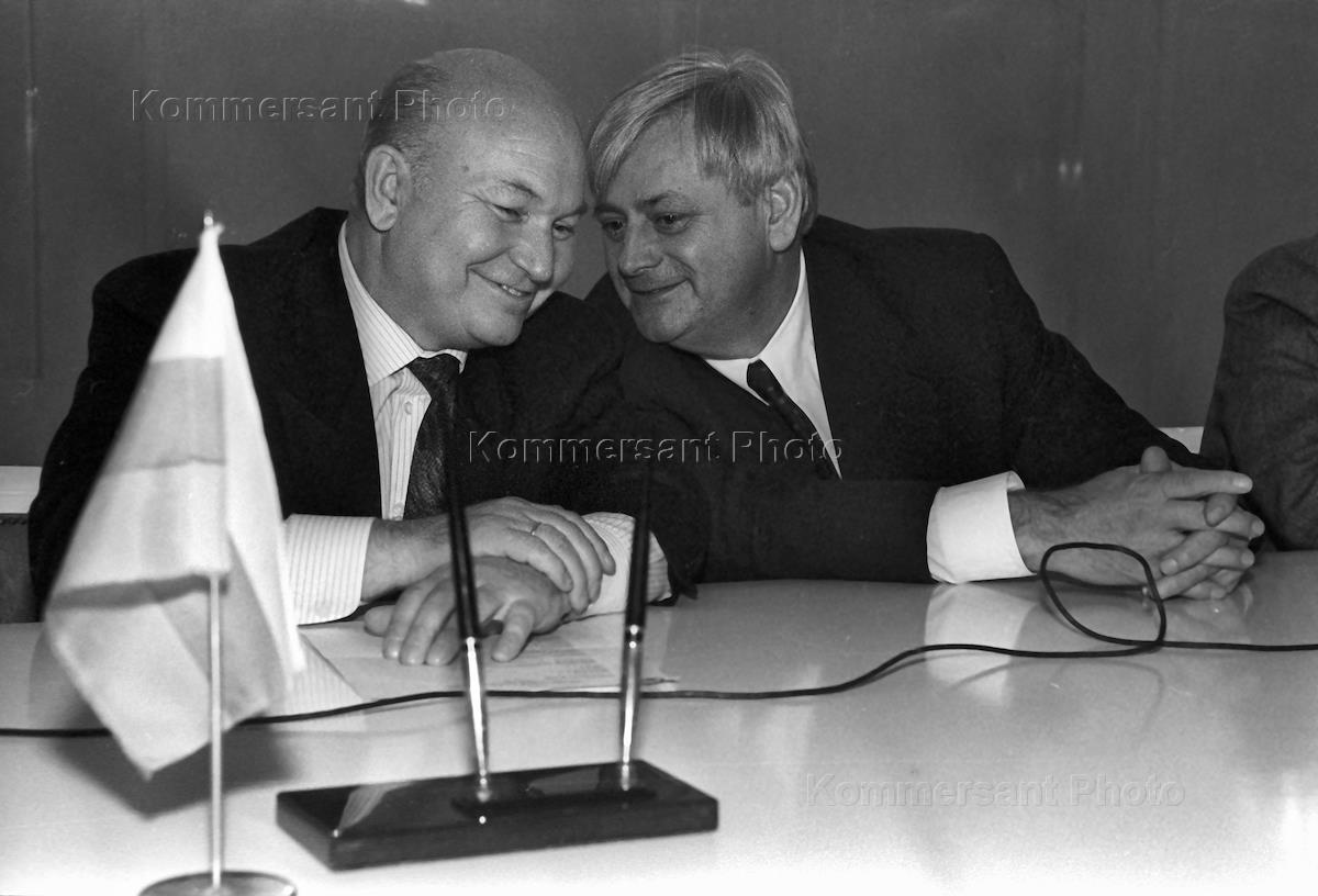 Moscow Mayor Yuri Luzhkov (left) and head of the Polish firm "Bartimpex" Gudzovat Alexander (right) during a meeting.