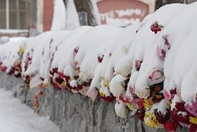 Акция памяти по жертвам пожара в клубе "Хромая лошадь". Заснеженные цветы на ограждении сквера Уральских добровольцев перед клубом.