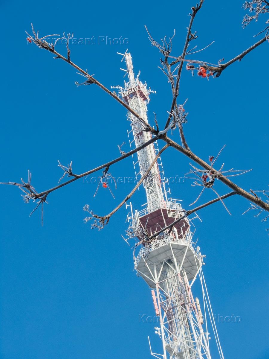 Жанровая фотография. Ветки рябины на фоне покрытой инеем телевизионной вышки.