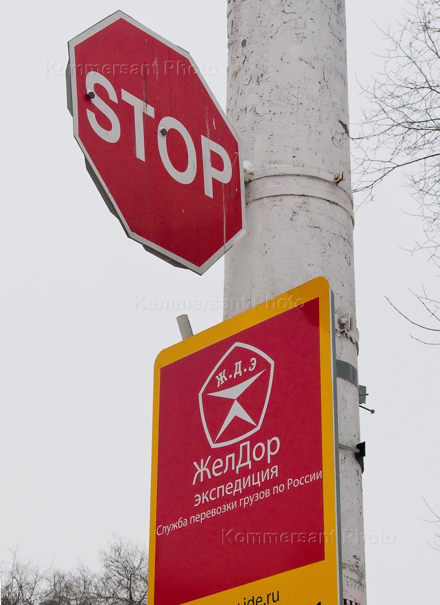 Жанровая фотография. Рекламный указатель компании по перевозке и доставке грузов "Желдорэкспедиция" и знак "Стоп".