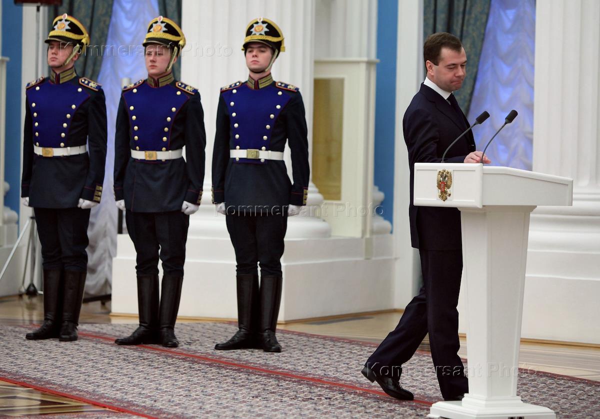 Russian President Dmitry Medvedev (center) at the ceremony of conferring the title "City of Military Glory." The ceremony was held in the Kremlin.