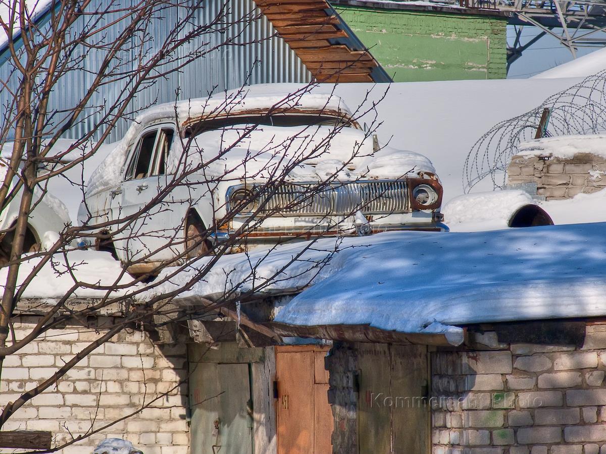 Жанровая фотография. Старый автомобиль "Волга" ГАЗ-24 стоит на крыше гаража.