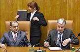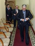 Президент Ассоциации банков России Гарегин Тосунян (в центре) и директор Федеральной миграционной службы (ФМС) России генерал-полковник милиции Константин Ромодановский (справа) перед началом подписания Соглашения о взаимодействии ФМС России и Ассоциации российских банков.