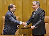 Президент Ассоциации банков России Гарегин Тосунян (слева) и директор Федеральной миграционной службы (ФМС) России генерал-полковник милиции Константин Ромодановский (справа) во время церемонии подписания Соглашения о взаимодействии ФМС России и Ассоциации российских банков.