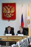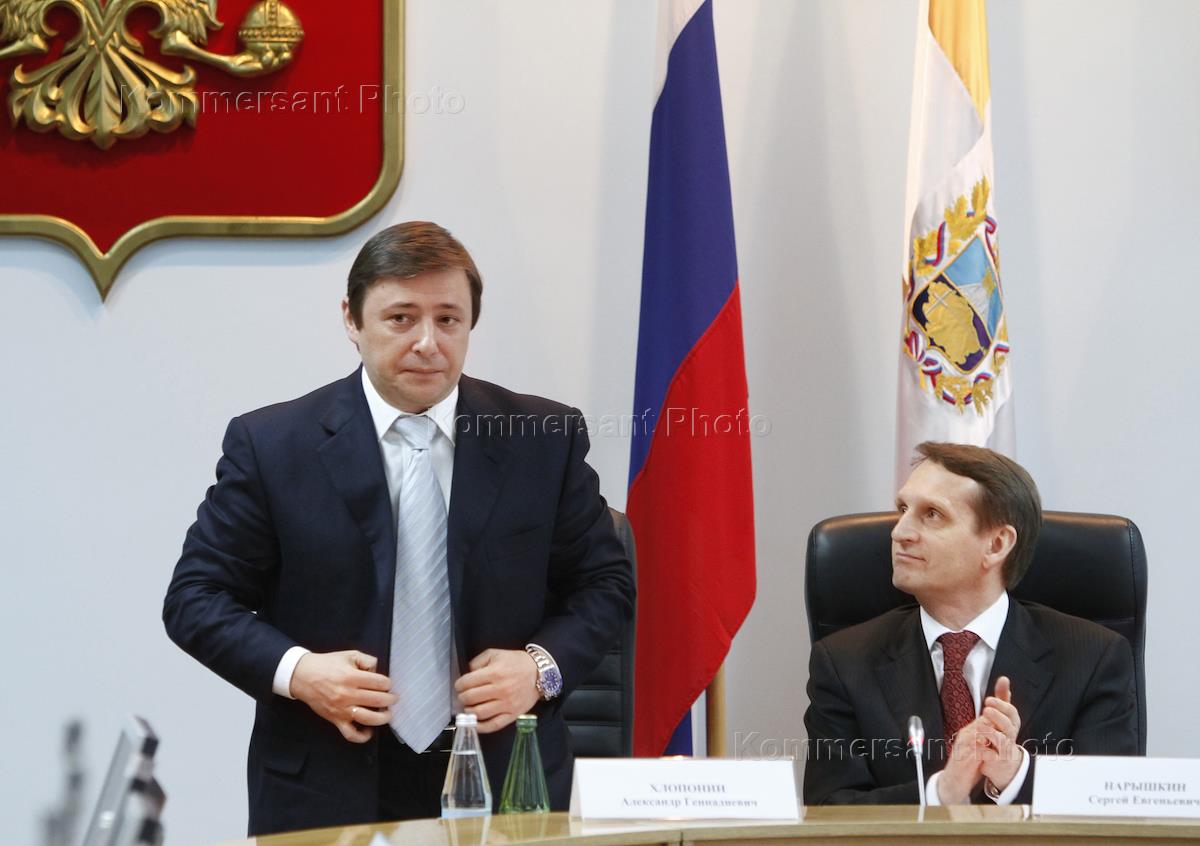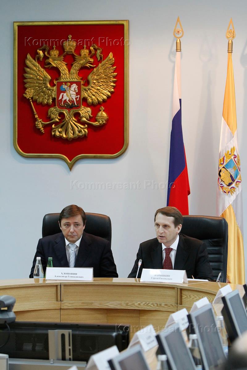 Полномочный представитель Президента России в Северо-Кавказском федеральном округе и заместитель председателя правительства России Александр Хлопонин (слева) и руководитель администрации президента России Сергей Нарышкин (справа) во время встречи.