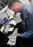 Сотрудник Государственной инспекции безопасности дорожного движения (ГИБДД) сверяет государственные номера с учетной записью компьютера в отделе регистрации (РЭО ГИБДД).