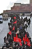 Митинг сторонников Коммунистической партии России (КПРФ) в день рождения Владимира Ленина прошел на Манежной площади. Шествие участников митинга к мавзолею на Красной площади.