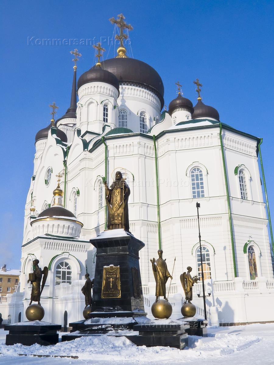 Город Воронеж. Благовещенский кафедральный собор Воронежской и Борисоглебской епархии. Памятник первому воронежскому епископу - святителю Митрофану у храма.