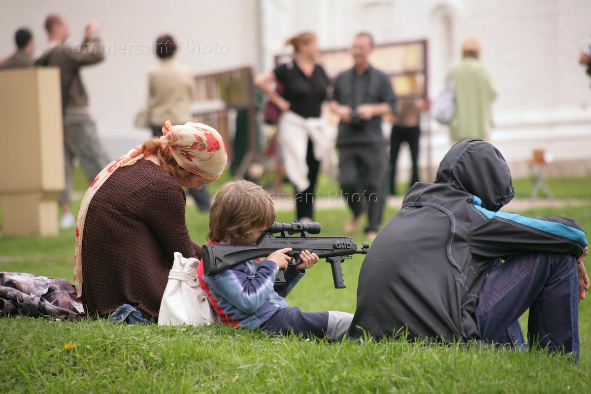 Жанровая фотография. Уличная торговля сувенирами. Тарелки с астрономическими часами "Орлой" и марионетки.