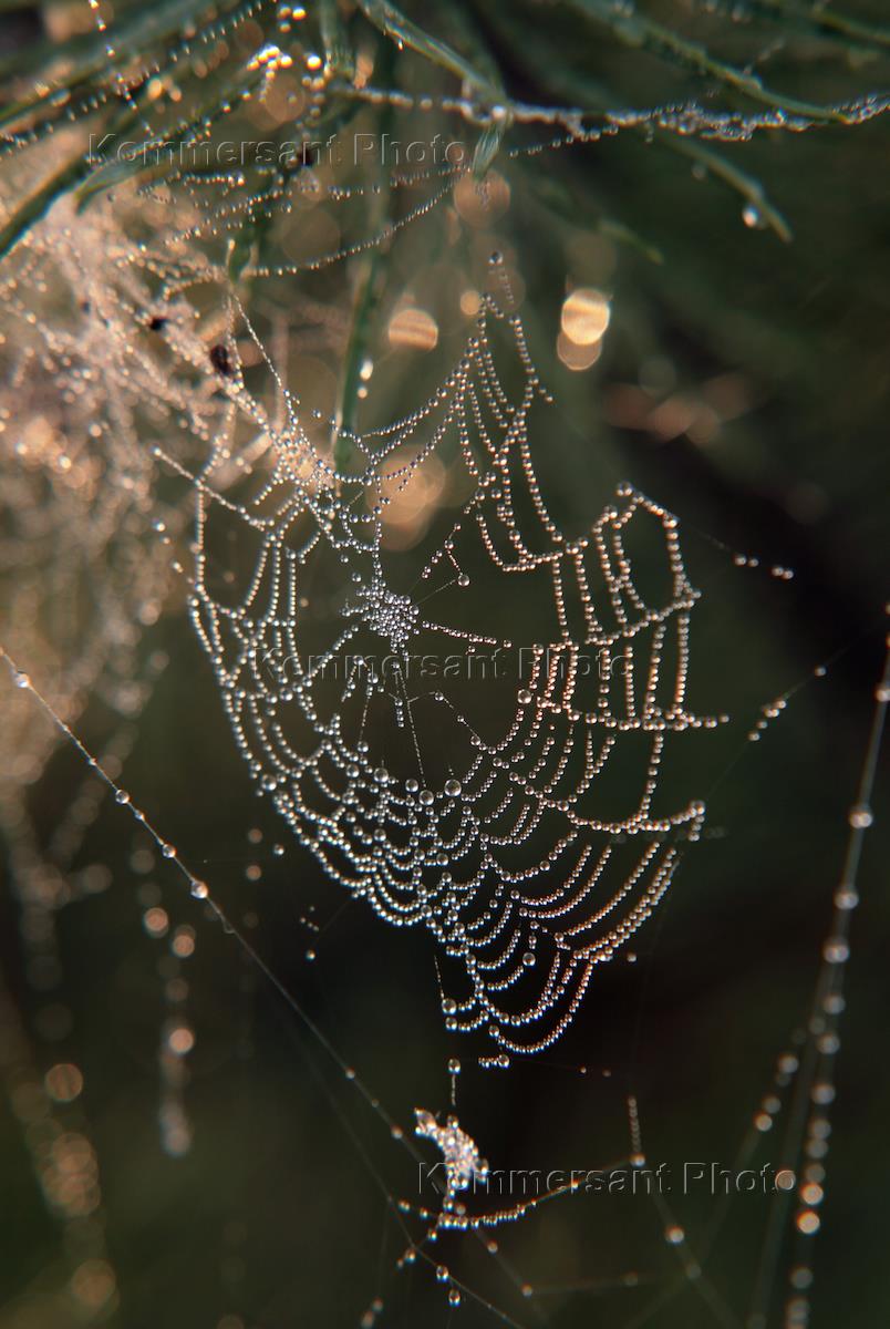Жанровая фотография. Паутина с капельками росы в подмосковном лесу.