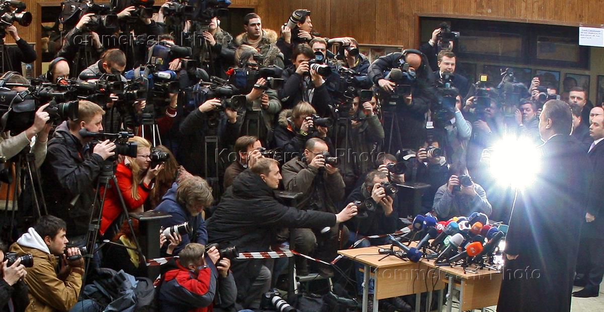 Второй тур выборов президента Украины. Кандидат в президенты Украины, лидер "Партии регионов" Виктор Янукович (справа) отвечает на вопросы журналистов после голосования на избирательном участке.