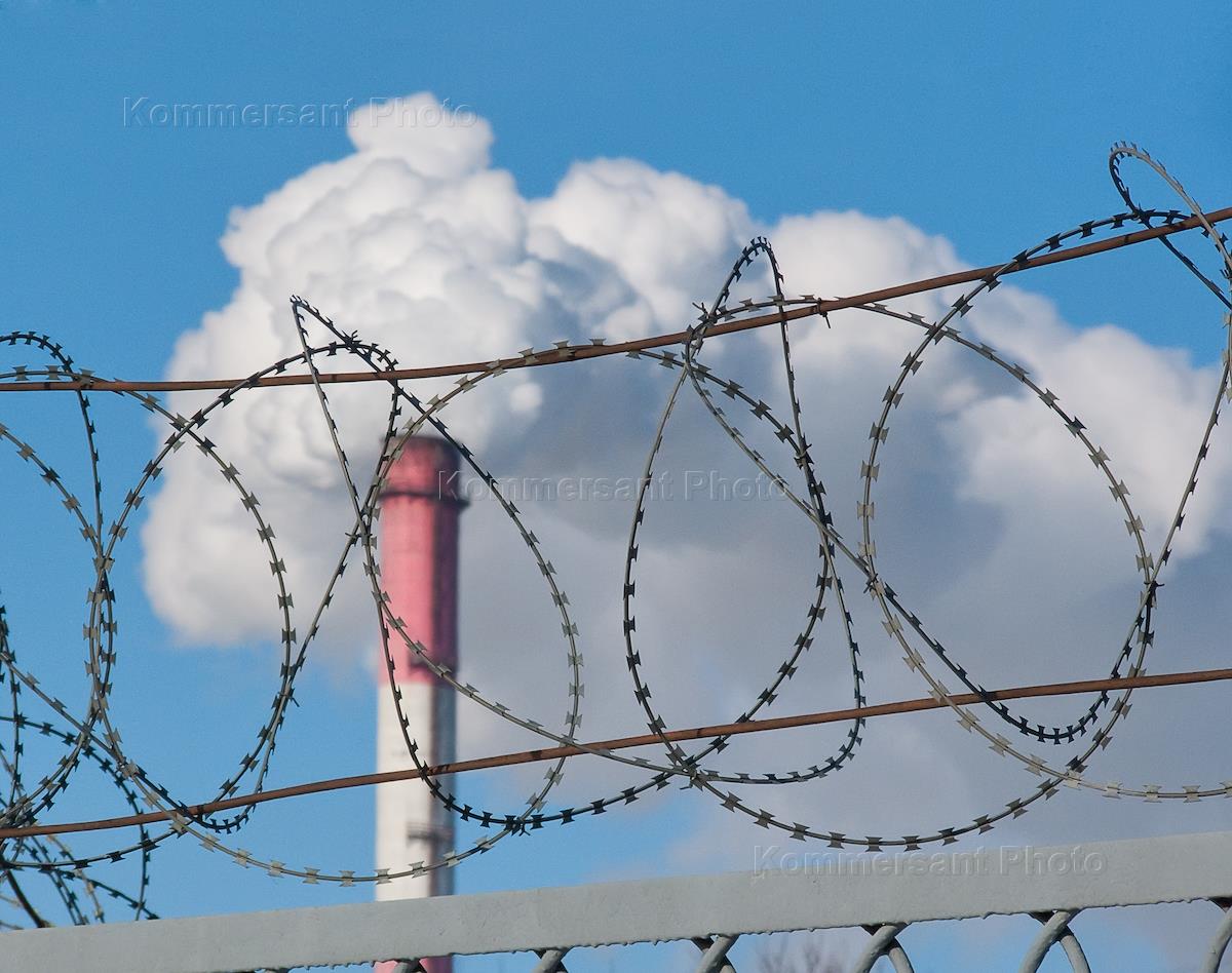 Жанровая фотография. Колючая проволока на фоне трубы котельной.