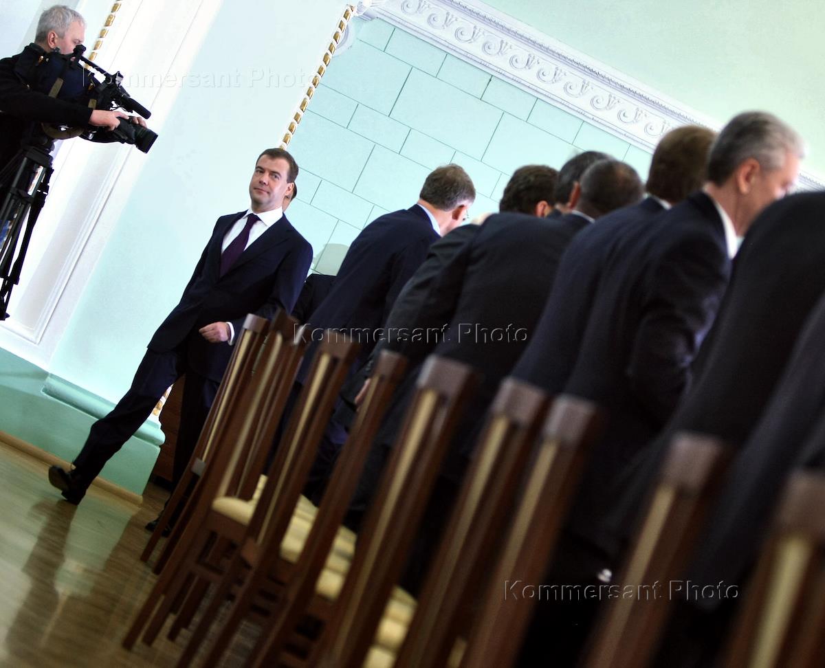 Слева направо: президент России Дмитрий Медведев, заместитель председателя правительства России - руководитель аппарата правительства России Сергей Собянин и первый заместитель председателя правительства России Игорь Шувалов на заседании комиссии по модернизации российской экономики.