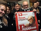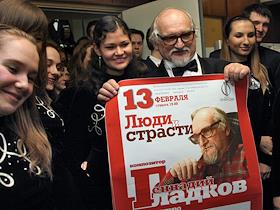 Композитор Геннадий Гладков (в центре) на авторском концерте "Люди и страсти", посвященному своему 75-летию. Концерт прошел в Концертном зале имени Чайковского.
