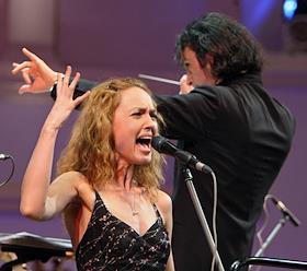 Джазовая певица Анна Бутурлина (слева) и дирижер Владимир Юровский (справа) во время выступления на авторском вечере "Люди и страсти", посвященном 75-летию композитора Геннадия Гладкова. Концерт прошел в Концертном зале имени Чайковского.