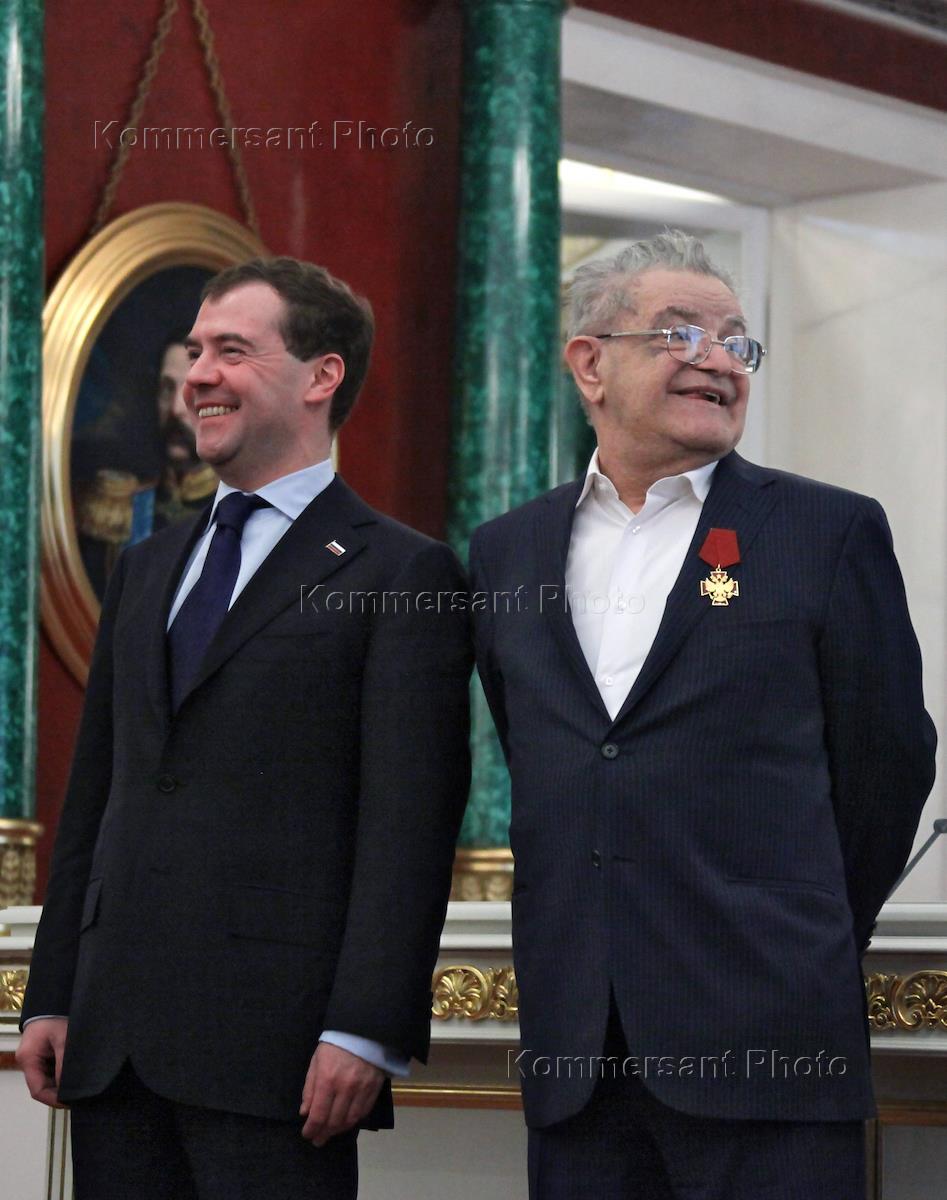 Президент России Дмитрий Медведев (слева) наградил писателя Фазиля Искандера (справа) орденом "За заслуги перед Отечеством" IV степени. Награждение состоялось в Кремле.