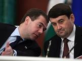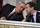 Президент России Дмитрий Медведев (слева) и министр транспорта России Игорь Левитин (справа) во время официальной встречи с президентом Абхазии Сергеем Багапшем. Встреча прошла в Кремле.
