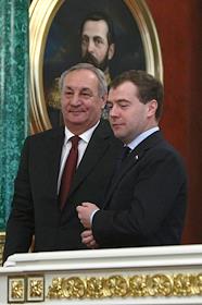 Президент Абхазии Сергей Багапш (слева) и президент России Дмитрий Медведев (справа) во время официальной встречи в Кремле.