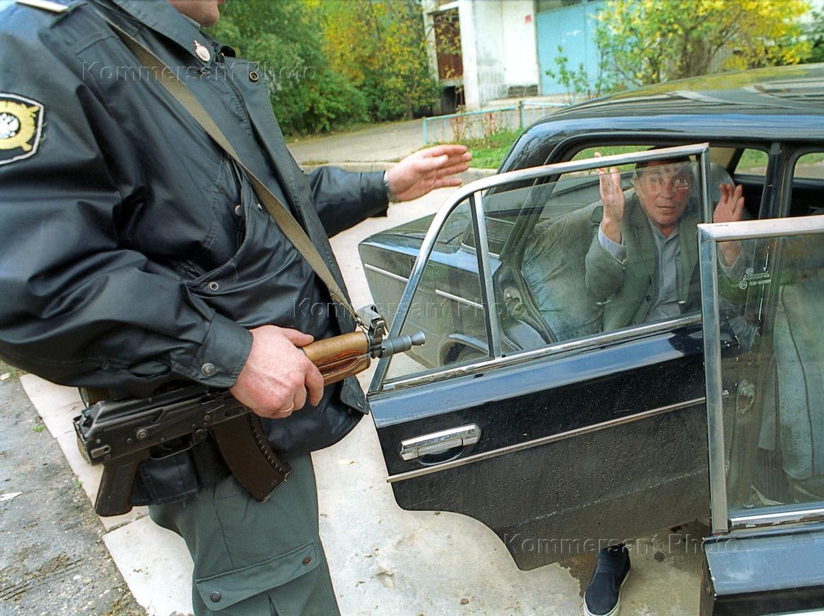 Милиционер с автоматом проверяет документы у владельца автомобиля во время милицейского рейда в Южном административном округе города Москвы.